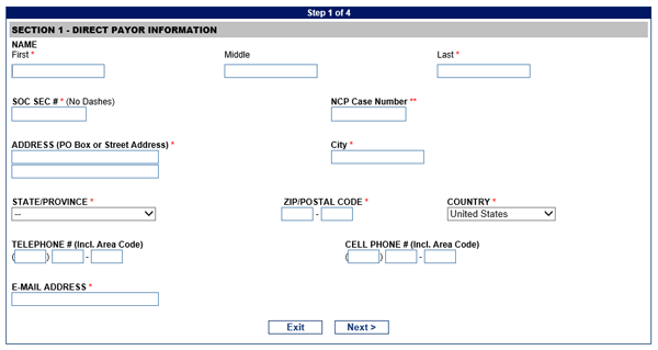 When registering for a new account, you will be asked for your Name, Social Security Number, NCP Case #, Address, and E-Mail Address.